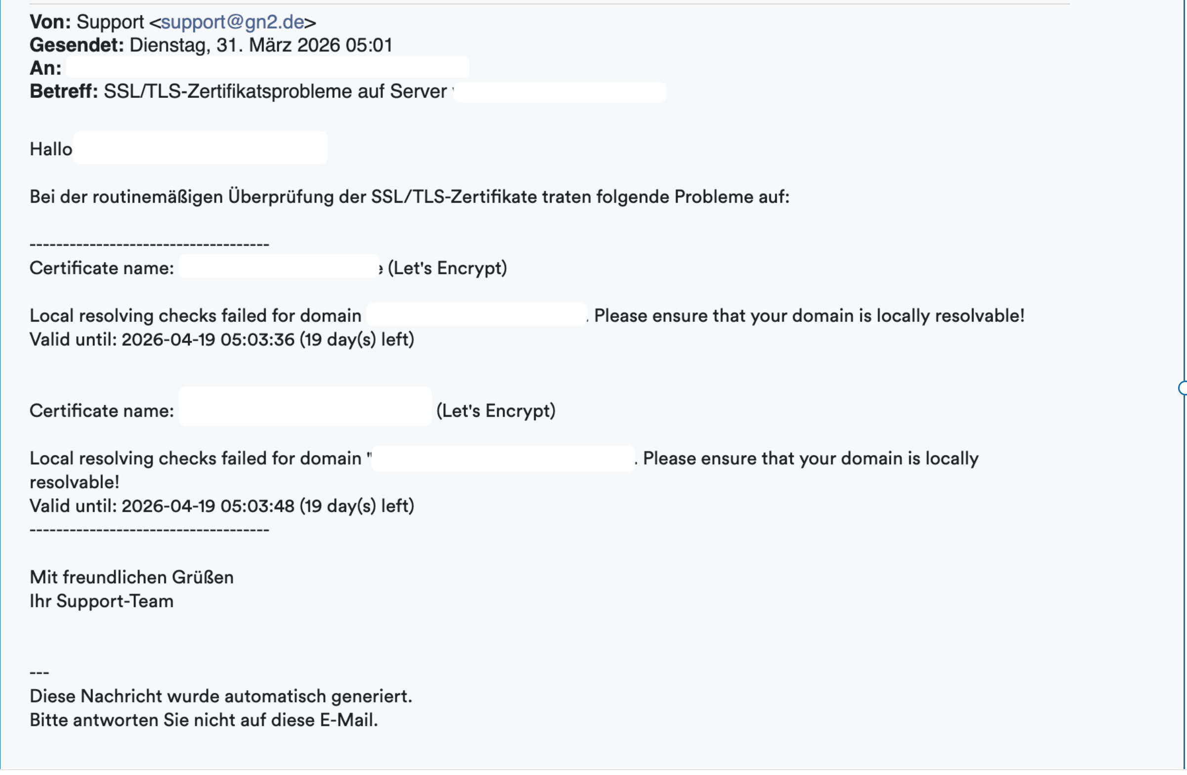 Bitte deaktiviere SSL, wenn deine Domain nicht mehr auf unseren Server zeigt (z. B. externe Nutzung) oder gekündigt wurde. Andernfalls erhältst du wiederholt Info-Mails, dass das SSL-Zertifikat nicht verlängert werden konnte.